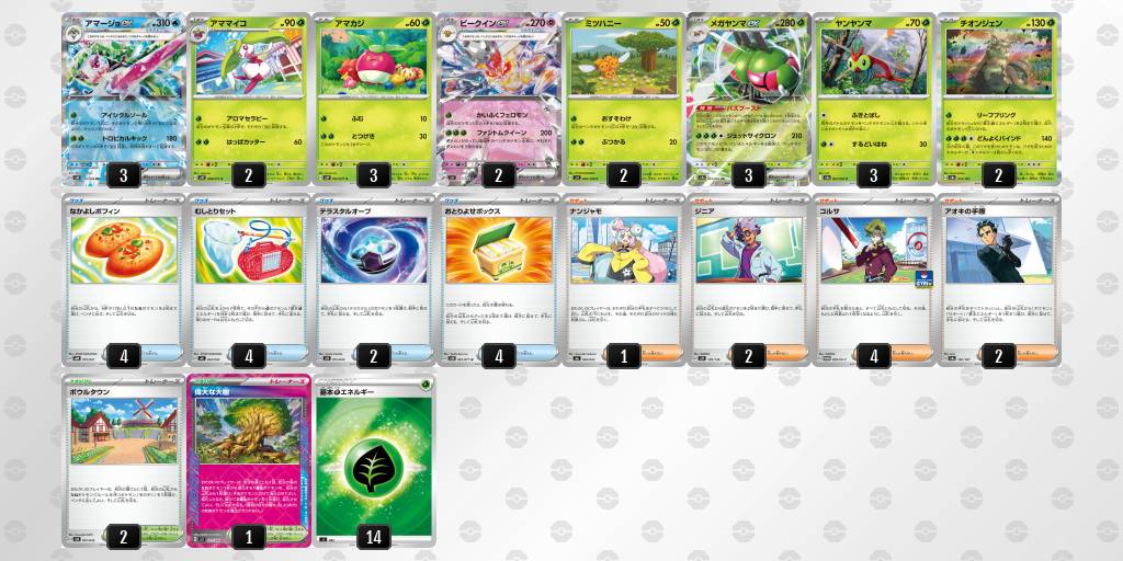 アマージョが1エネで相手ポケモン1匹のHPが30になるようにダメカンをのせれるわざを持っていて、ビークインは3エネ200点でダメカンがのっている相手ベンチポケモン全員にもダメカンを3個のせます