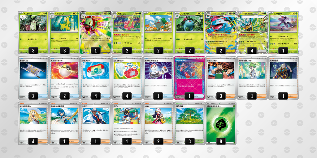 メガニウム、フシギバナ、ゲノセクト、オーガポン。豊富なアタッカーを使い分けて戦います。